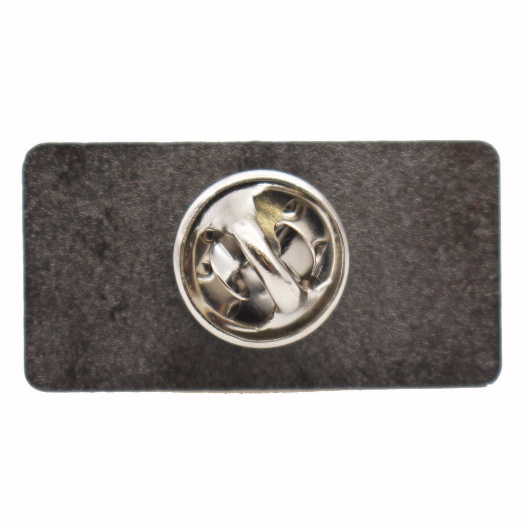 This metal enamel pin measures approximately 1 inch tall and has a standard butterfly clasp backer.