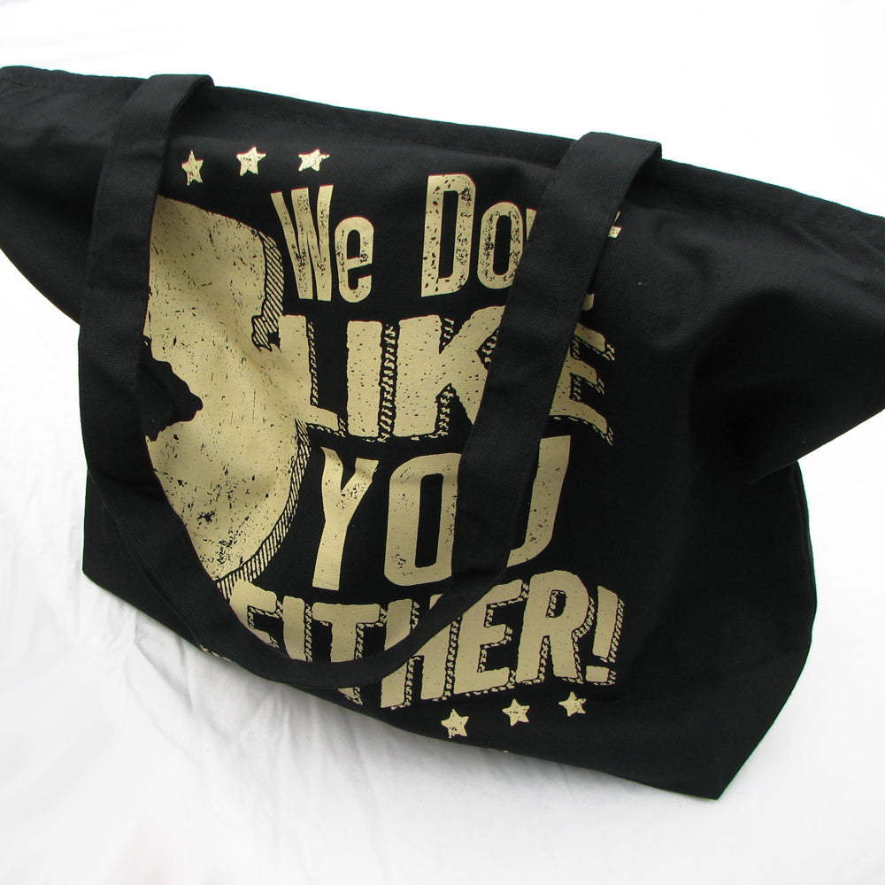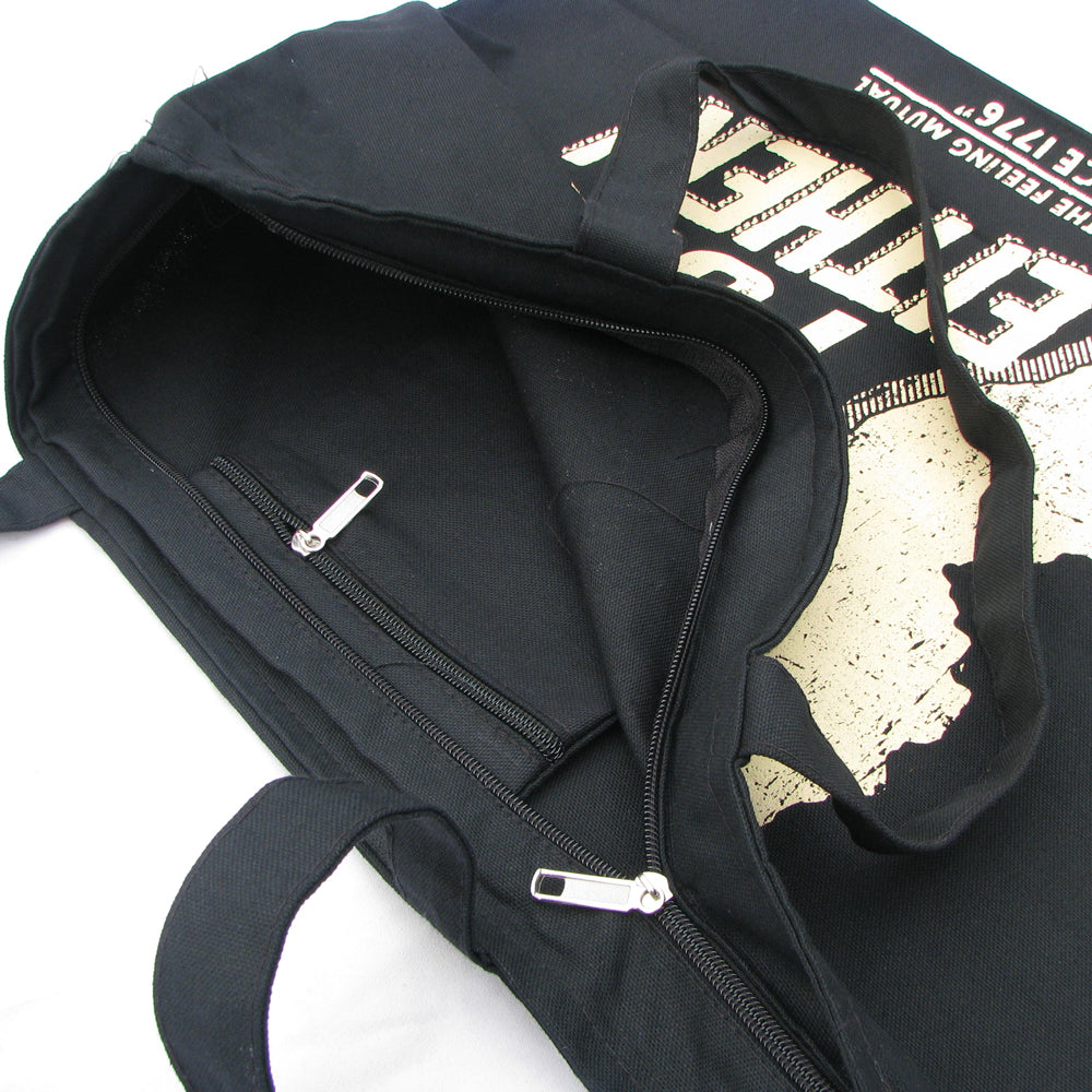 Made from 12oz. soft and sturdy cotton canvas. Measures approximately 20 inches wide, 15 inches tall, and with a 5 inch bottom gusset for ample storage capacity. The handles are about 23 inches long making for a 10 inch drop. It has a zipper on the main compartment as well as a small zippered interior pocket for small valuables.